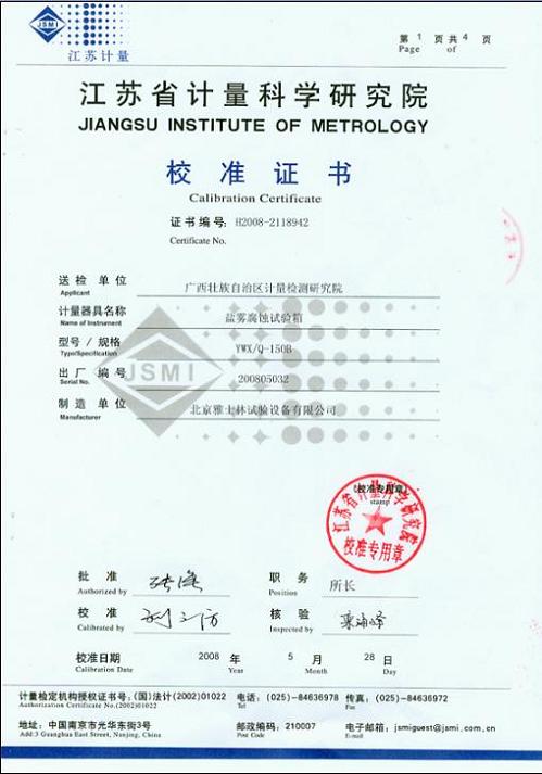 >>鹽霧腐蝕試驗(yàn)箱校準(zhǔn)證書-江蘇計量院-廣西計量院